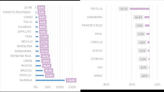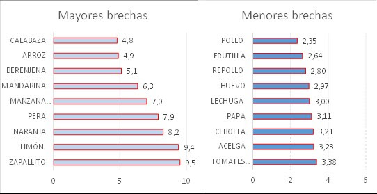 Los productos con menores brechas, en tanto, fueron: el pollo (2,35 veces), la frutilla (2,64 veces), el repollo (2,8 veces), el huevo (2,97 veces) y la lechuga, con una brecha de 3 veces.