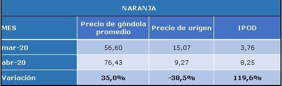 La naranja, cuya brecha había caído 72,3% en marzo, creció 119,6% en abril, seguida por el repollo (+33,9%) y el brócoli (+29,6%).