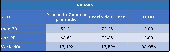 El IPOD repollo subió 33,9% en abril. El aumento de la brecha IPOD se explica por un alza de 17,1% en los precios de destino frente a una disminución del 12,5% en los precios de origen. En origen, la variación del precio de acuerdo a lo informado por los productores, se debe a un aumento en la oferta, dado que entró la producción de Santa Fe, sumado a una caída en la demanda, por la situación del consumo. Argumentan que al inicio de la cuarentena obligatoria se habían generado cambios en el comportamiento del consumidor, ya que éste optaba por “stockearse” y comprar mayores cantidades de lo habitual con el fin de asegurarse la disponibilidad del producto. Eso ya se normalizó. Interanualmente, se observa una variación del 244,49% en el precio de origen.