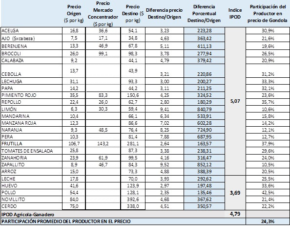 Así, la diferencia de Precio Origen-Destino indica la cantidad de veces que aumenta el precio del producto al comercializarse en góndola.
